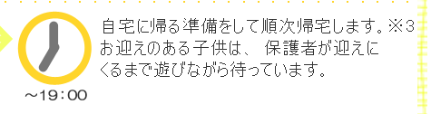 夏季は17:30、冬季は16:30以降は保護者のお迎えが必要です。